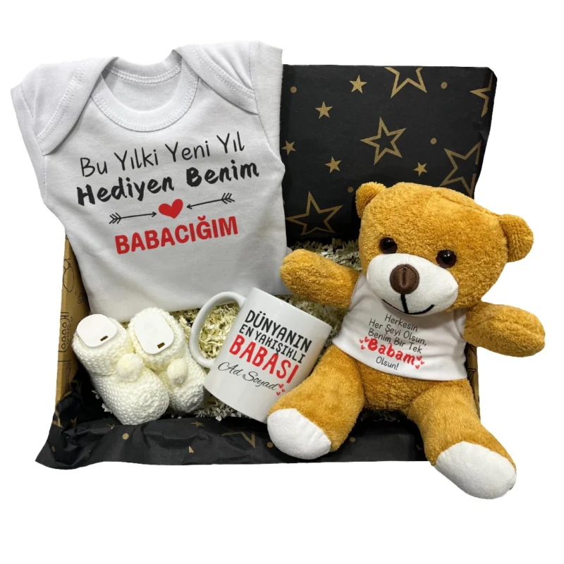 En Yakışıklı Baba Baskılı Düz Kupa Zıbın Ve Ayıcık Yeni Yıl Hediye Seti