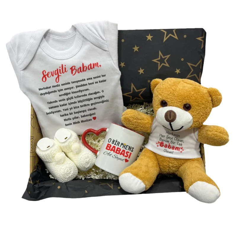 Prens Babası Baskılı Kalpli Kupa Zıbın ve Ayıcık Yeni Yıl Hediye Seti